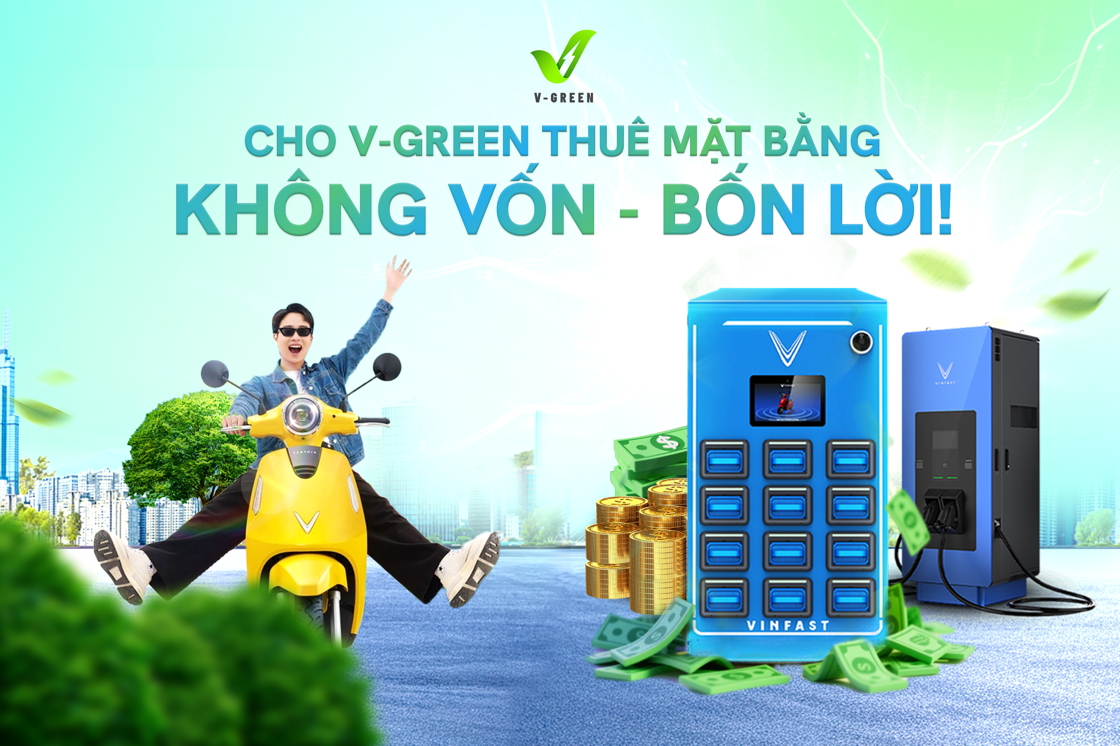 Với mong muốn nhanh chóng hiện thực hóa mục tiêu phủ rộng hạ tầng sạc xanh trên khắp cả nước, giúp giảm phát thải và thúc đẩy giao thông xanh Việt Nam bền vững, V-Green mở rộng chào đón các đối tác cho thuê mặt bằng đặt trạm sạc và tủ đổi pin trên toàn quốc, nhận về các quyền lợi hấp dẫn với chi phí đầu tư không đồng.